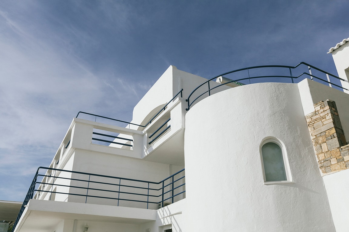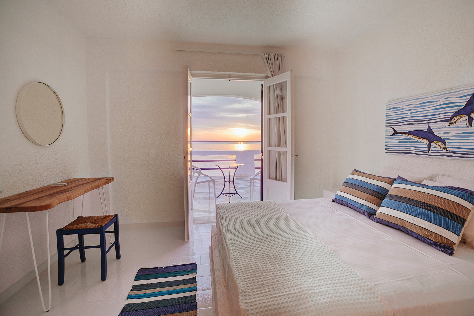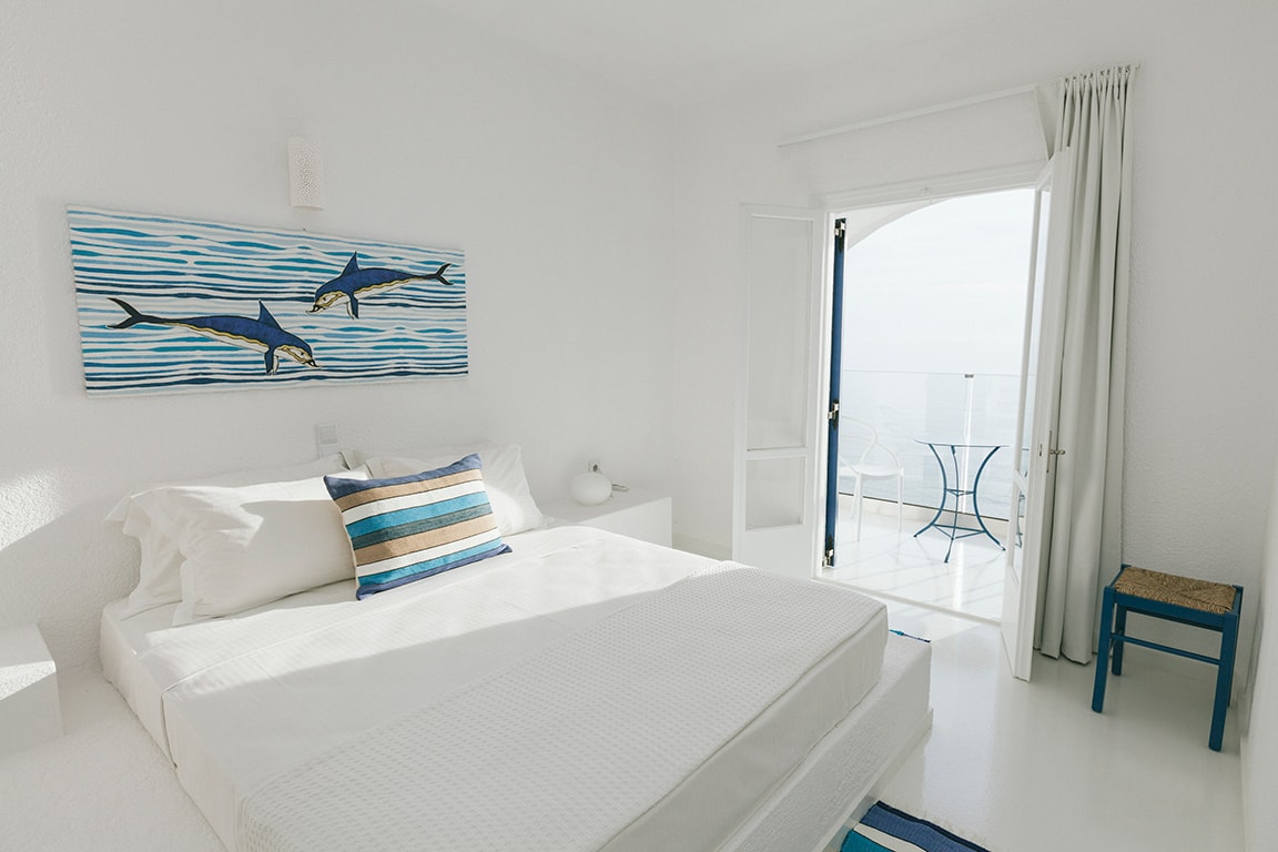 The 23 sea-facing rooms at the resort are a study in the typical Greek island aesthetic. Whitewashed walls, Aegean blue interior details, and, of course, unrivalled views of the sea due to its location on the hill of Vathy combine to create rooms that are as peaceful as they are breathtaking.