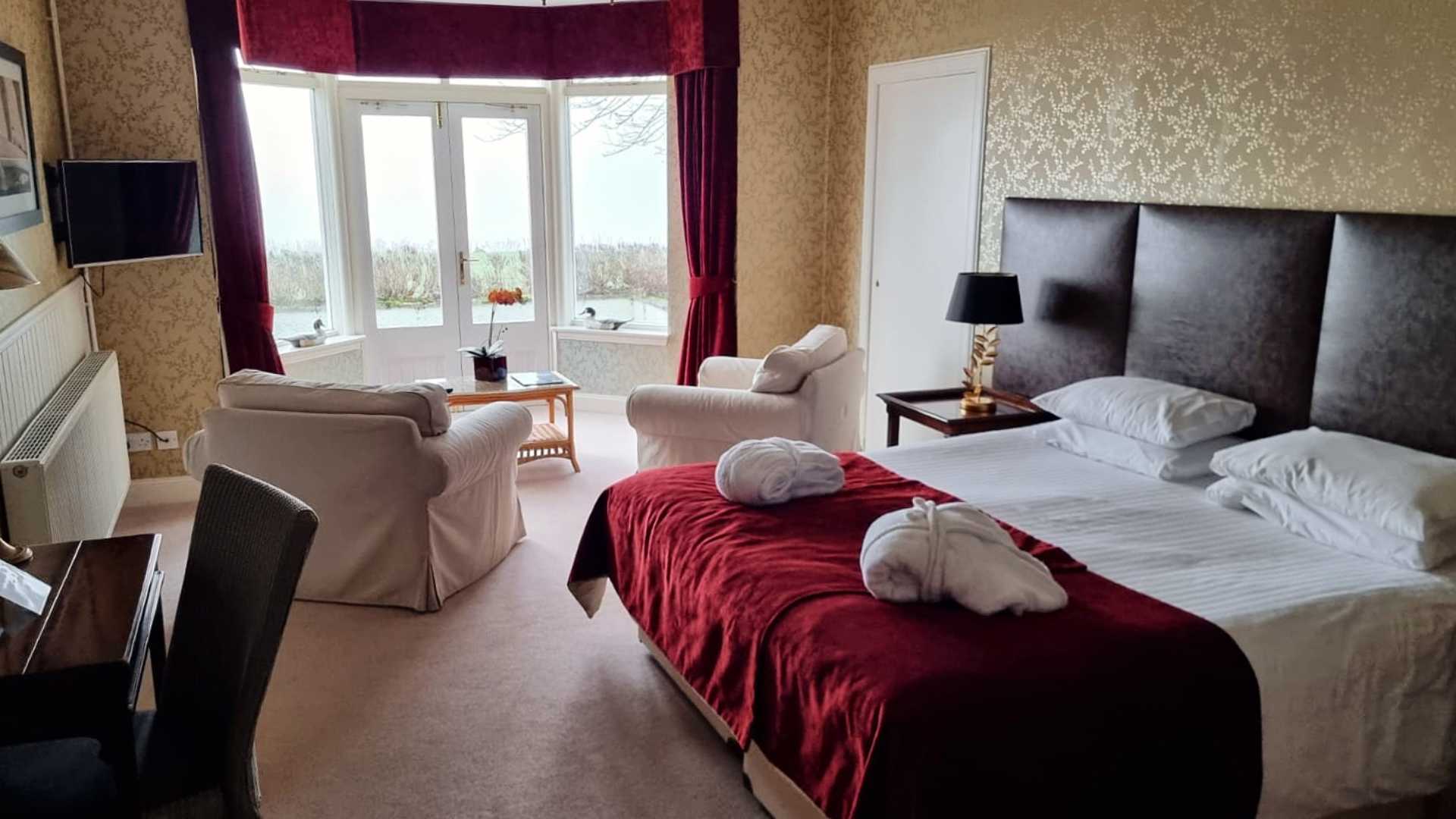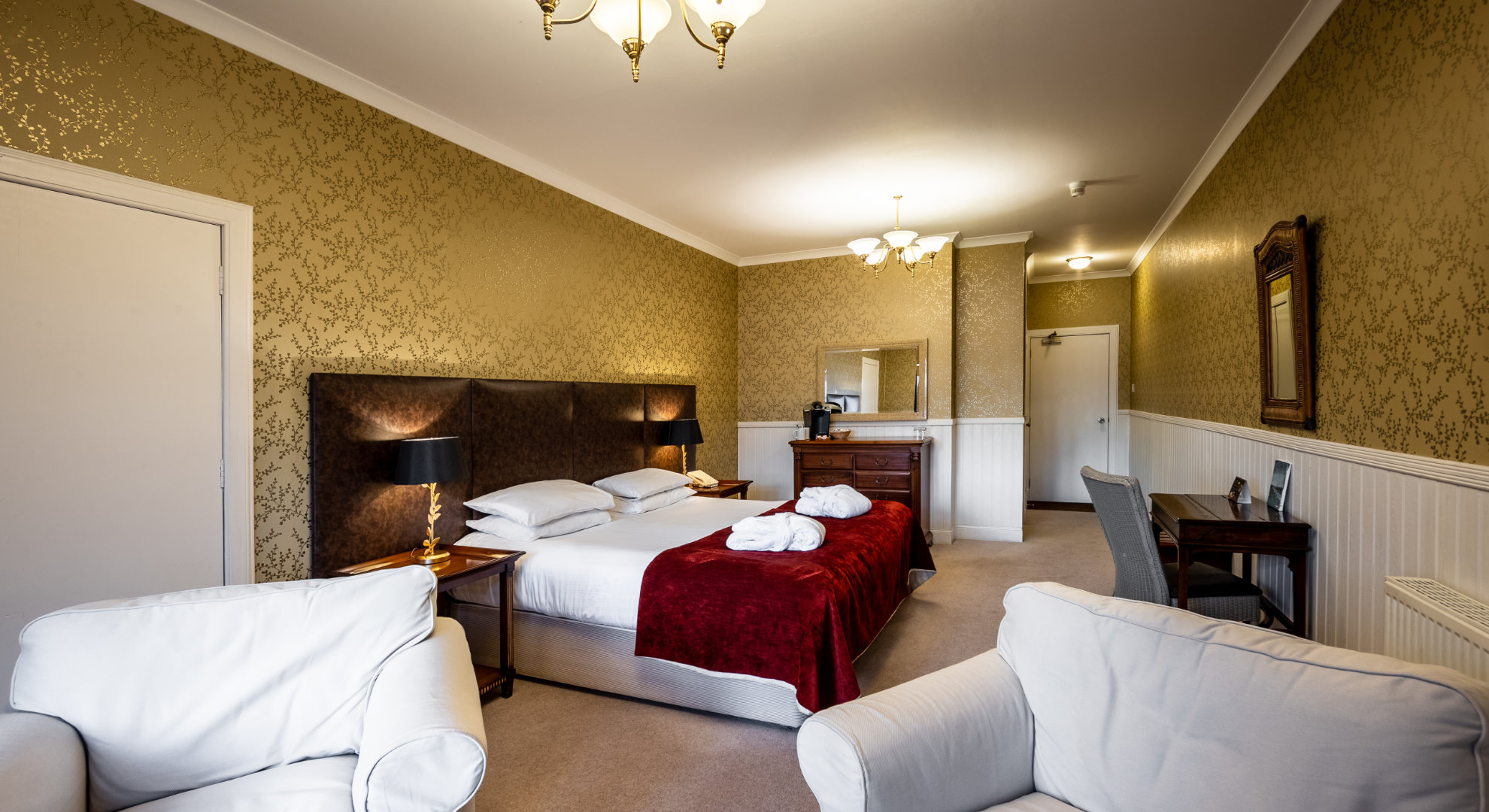 The Deluxe Rooms at Lake of Menteith are spacious and comfortable, with huge en-suite bathrooms that include roll-top bath tubs, double basins, walk-in showers, and plush bathrobes. This accommodation type offers stunning views of the lake and the surrounding hills and mountains.