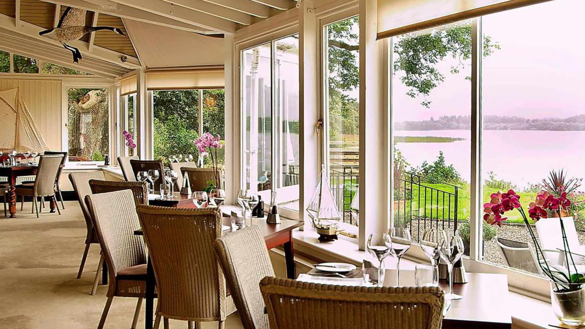 A huge wooden terrace and terracing along the waterfront overlook The Lake. Seasonal local timber and stone, oak beams, and a massive open hearth fireplace all contribute to a very calming environment.